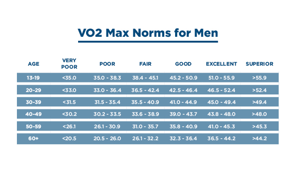 Además de la forma física, las puntuaciones de VO2 máx pueden variar en función de factores como el sexo, la edad y la genética. La medición de VO2 máx para una persona media de entre 30 y 40 años se situará en torno a: