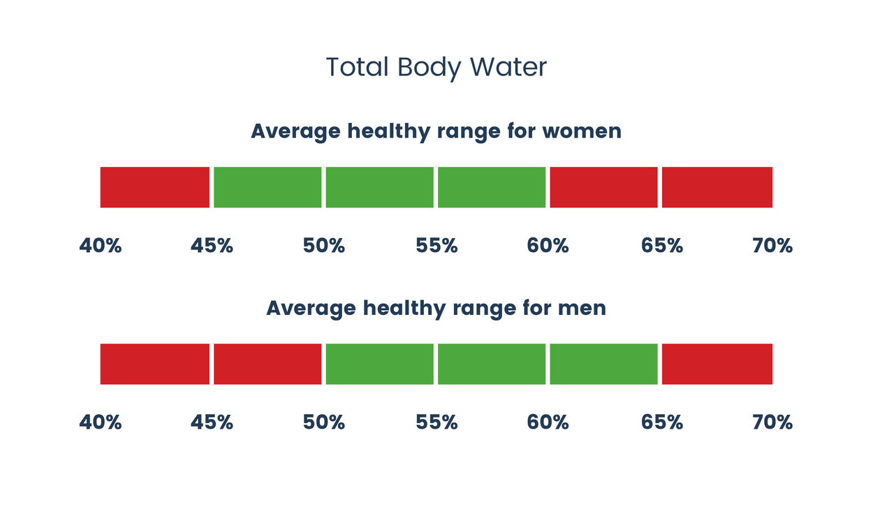 El porcentaje de agua corporal ideal varía. Depende de varios factores. El sexo, la edad y la composición corporal afectan a este porcentaje. En general, las mujeres tienen un porcentaje de agua corporal inferior al de los hombres. Esto se debe a que las mujeres tienen más tejido que los hombres. El porcentaje ideal para las mujeres adultas oscilará entre el 45 y el 60 %, mientras que el porcentaje ideal para los hombres adultos estará entre el 50 y el 65 % del total del cuerpo. Para los tipos de cuerpo realmente atléticos y en forma, se recomienda incluso tener un 5 % más de agua corporal que la media de los adultos.