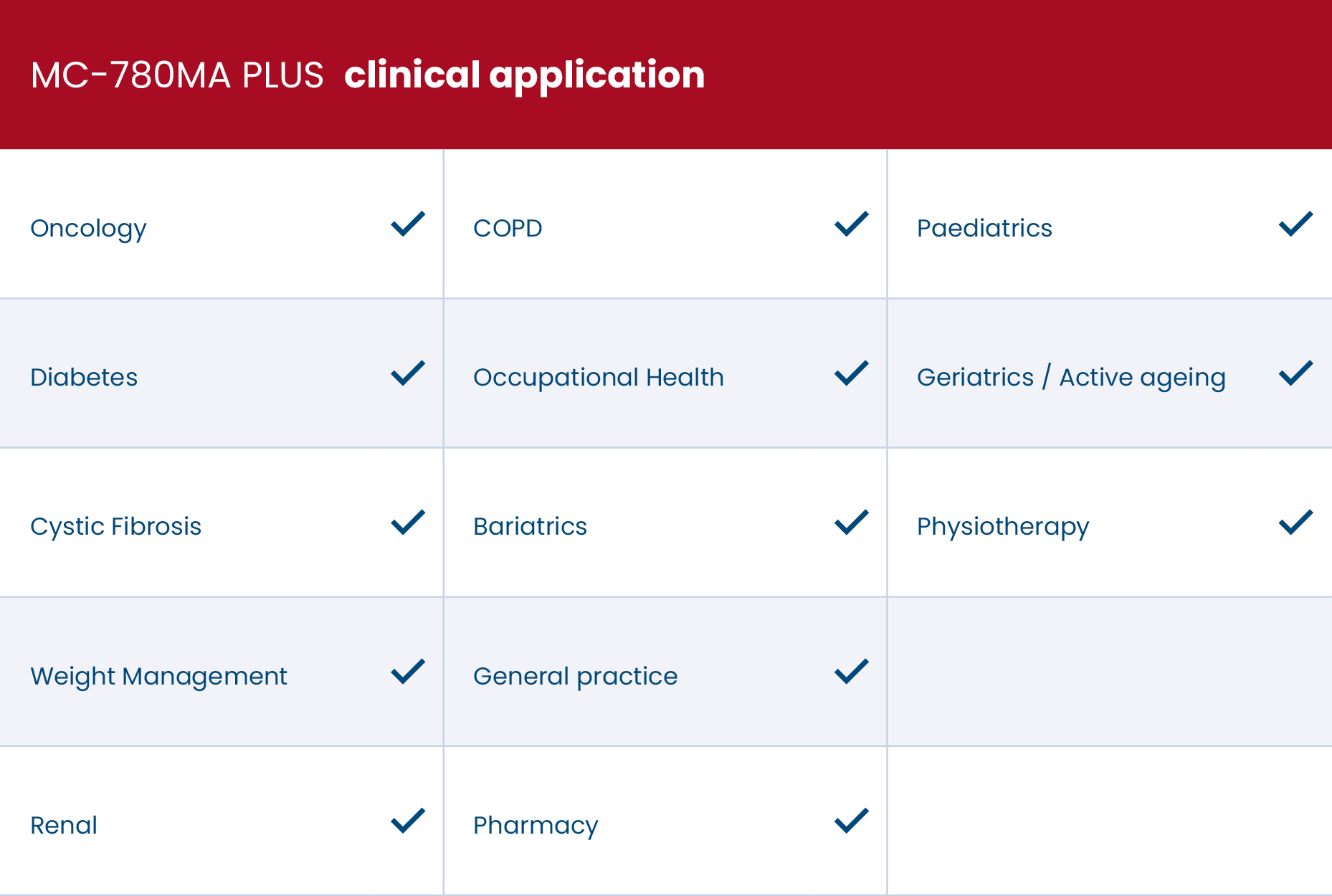 The MC-780MA P multi frequency segmental body composition monitor provides an instant analysis of the health and fitness of your clients. Additionally, the MC-780MA P monitors the progress over time. The user-friendly monitor is designed as an interactive device, allowing clients to easily perform measurements themselves, without specialist assistance. This makes the monitor very suitable for use in gyms, although the medically certified MC-780MA P is very widely applicable within various medical specialties. It is not a coincidence that the MC-780MA P is our most sold professional model.